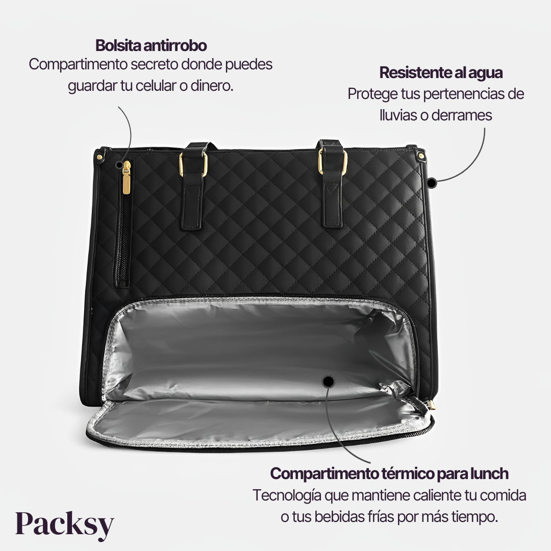 Con doble compartimento, interior térmico y diseño elegante, Packsy™ es perfecta para oficina, escuela, gym o escapadas express.